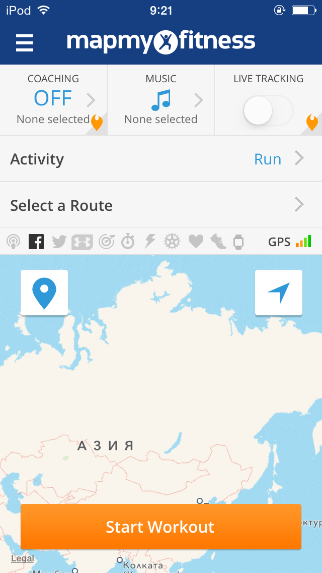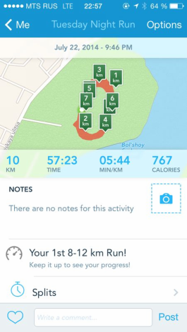 Еще одна программа с набором стандартных функций (музыка фоном, постановка целей, слежение за дистанцией и темпом), но упор в ней сделан на соперничестве с друзьями. Если в том же Runtastic соцсетям выделена одна строчка в меню (данные о тренировке по умолчанию отправляются в «Твиттер» и «Фейсбук»), то RunKeeper постоянно предлагает похвастаться своими достижениями, прикрепив к посту карту с маршрутом.