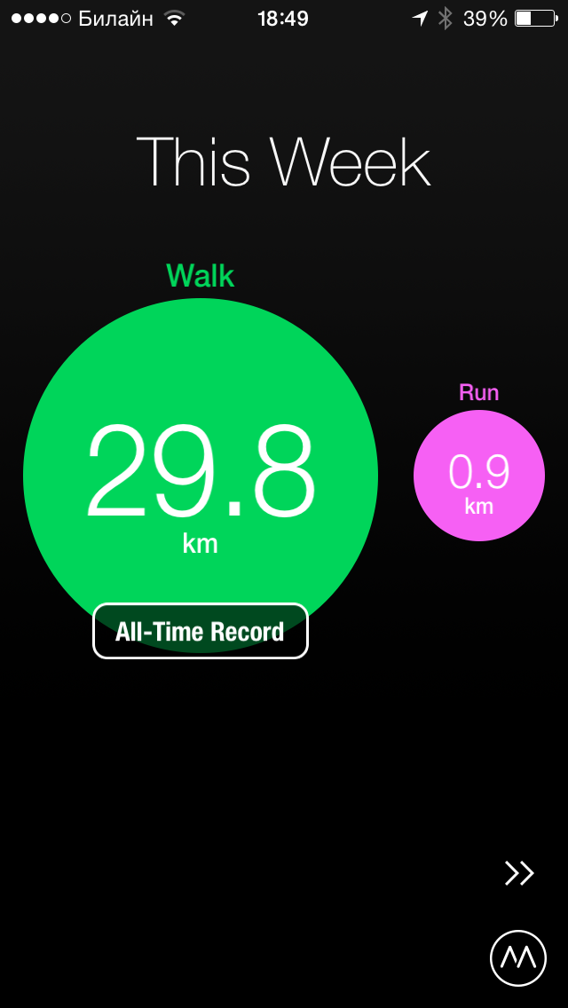 Известная китайская пословица «Чтобы быть здоровым, нужно проходить 10 тысяч шагов в день» нашла свой отклик в сердцах разработчиков убийцы фитнес-трекеров — Moves абсолютно бесплатна, но обладает практически той же функциональностью, что и браслеты за несколько тысяч рублей. После недолгой регистрации (аккаунт нужен для хранения данных) программа засветится зеленым кружочком — внутри него будет отображаться либо количество пройденных за день шагов, либо количество уничтоженных калорий (таким образом можно компенсировать съеденный бигмак или картошку фри).
