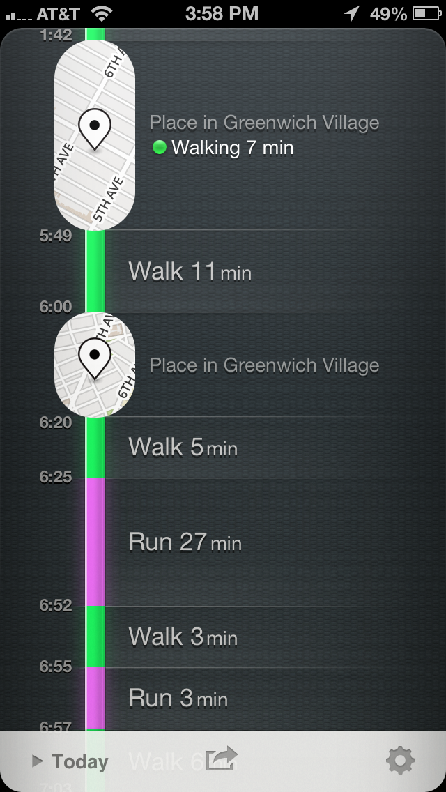 Учет колебаний смартфона плюс карта местности — этот тандем позволяет Moves достаточно четко разграничивать прогулки/пробежки/велосипед и передвижение на транспорте, во время которого калории сжигаются в минимальном количестве (если только вы не толкаетесь за свое место возле поручня).