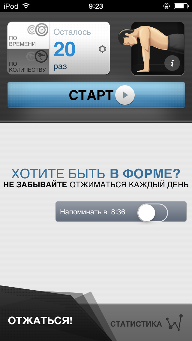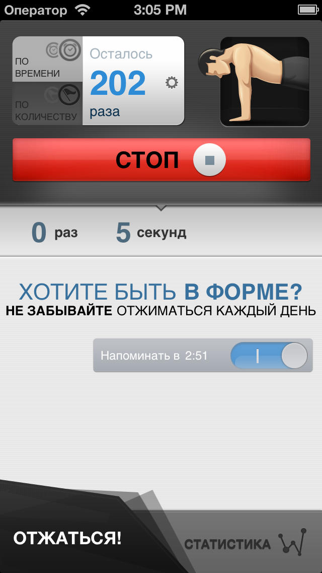 В лаконичном приложении есть два режима (на время и на количество), а также статистика (она будет вдохновлять вас после нескольких дней тренировок) и напоминания (фактически — интегрированный будильник). Никаких минусов у «Отжиматора» нет: он позволяет сосредоточиться на дыхании, не отвлекаясь на подсчет количества отжиманий.