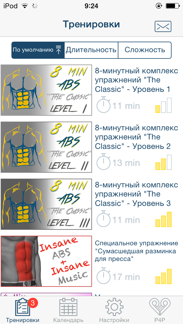 Несколько приложений от одного разработчика (Passion4Profession) должны помочь тем, кто готов усердно заниматься, но не хочет приобретать абонемент в спортзал. Для создания рельефного пресса, подкачанной груди и упругих мышц ягодиц нужны только коврик (около 1 000 рублей в любом спортивном магазине), смартфон и мечта свернуть горы. Во всех трех приложениях работает стандартный принцип — формируется программа (первые три недели — по три занятия, с четвертой — по четыре), после чего пользователь начинает отмечать сделанные упражнения в календаре.