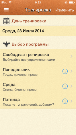 Дневник тренировок заставляет отнестись к делу со всей серьезностью еще до захода в приложение — с иконки на вас смотрит образцовый пресс, который как бы намекает: если часто пользоваться программой, у вас будет такой же рельеф. Внутри Training Diary являет собой электронную записную книжку для учета занятий — можно выбирать день, вес, количество повторений и упражнения. На первый взгляд, упражнений непозволительно мало, но после нажатия на клавишу «изменить» откроется весь список, который можно назвать исчерпывающим — например, 10 различных видов упражнений «на пресс» позволят привести живот в тонус.