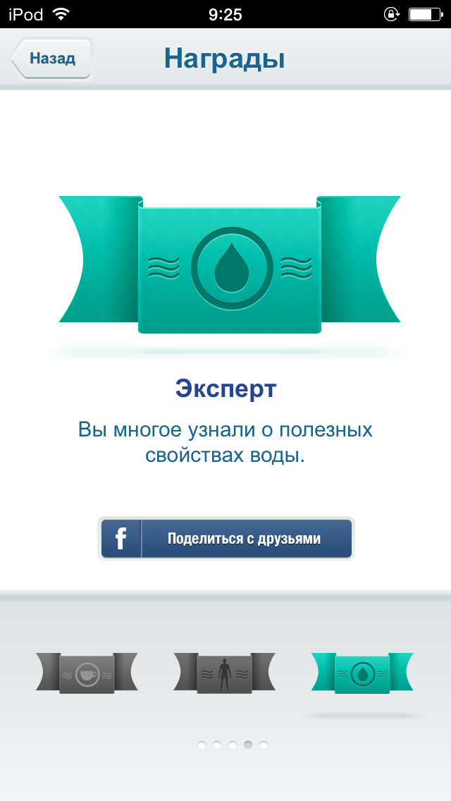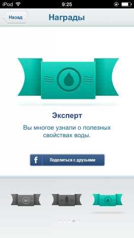 О важности поддержания водного баланса приложение сообщает несколькими слайдами, образующими своеобразный раздел FAQ: как выясняется, вода (природная и негазированная) положительно воздействует на мозг, кожу, печень, самочувствие и иммунитет. Для тех, кто твердо решил ходить в спортзал через день и совершать ежедневные пробежки, вопрос бодрости — один из приоритетных: поначалу кажется, что на физические упражнения уходят все силы.