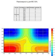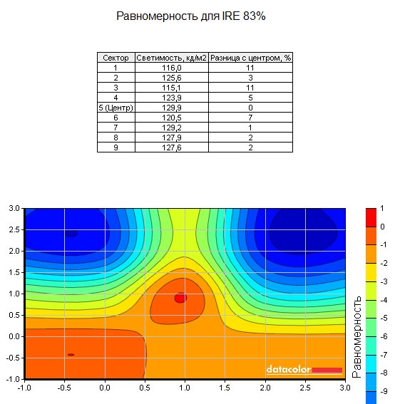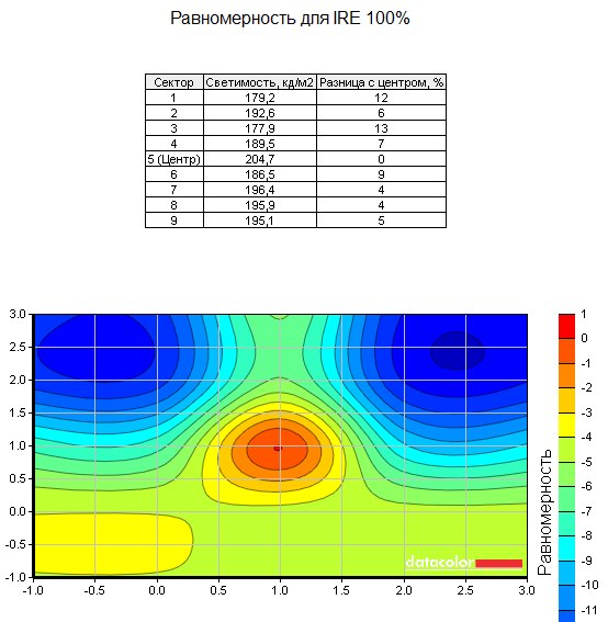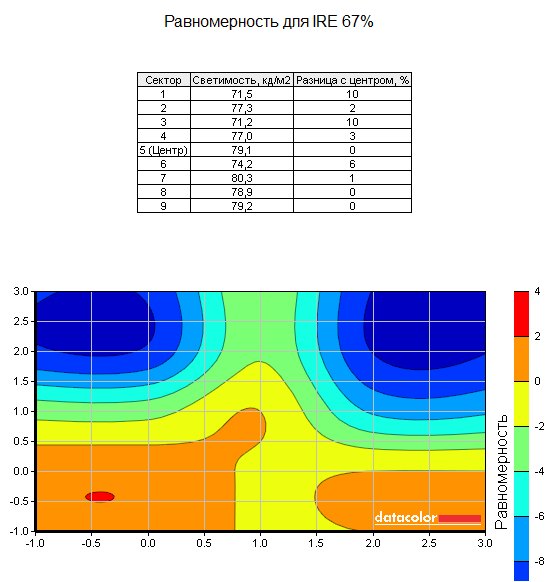 Тестирование равномерности подсветки дало в целом приятную картину: несмотря на градиентный характер убывания яркости внизу экрана, разброс яркости между самым светлым и самым тёмным участком экрана в основном не превышал 10%, а при большой яркости отклонение почти нигде не превысило 5-7%, разве что с некоторой аномалией в центре.