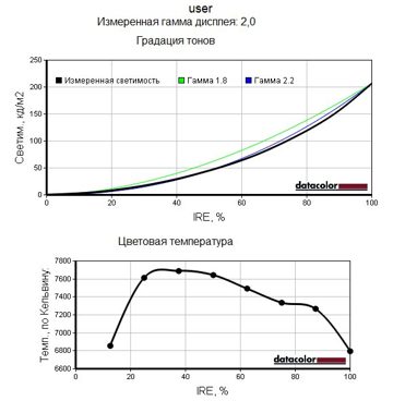 Измерение яркости, контрастности и равномерности подсветки производилось в режиме «Пользовательский», при максимальном положении регуляторов RGB в настройках цветопередачи. Интересно в этой связи отметить, что максимальная светимость белого значительно превышает заявленную в паспортных характеристиках яркость и дисплей действительно очень яркий. Контрастность хороша и находится на типичном для современных TN-матриц уровне, хотя яркость чёрного поля всё же несколько великовата. Радует также стабильность цветовой температуры экрана, весьма близкая к эталонному уровню 6500 К.