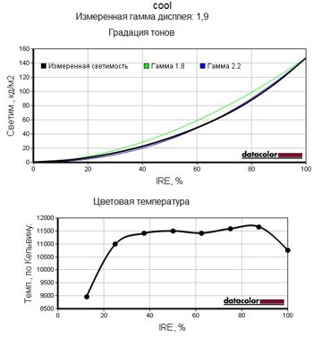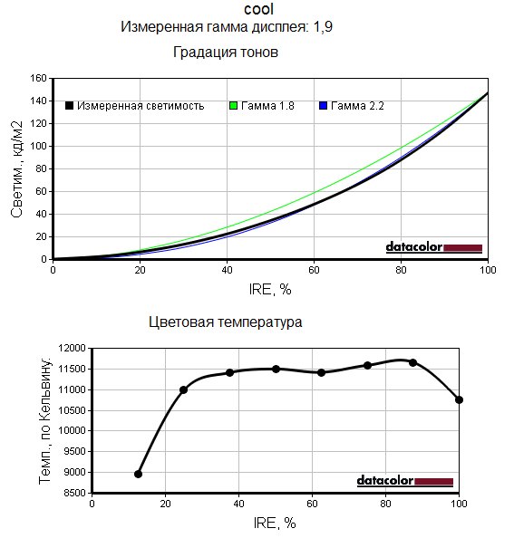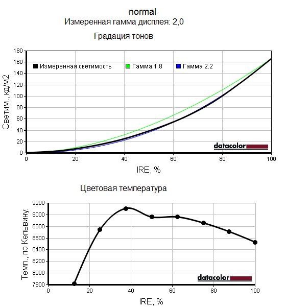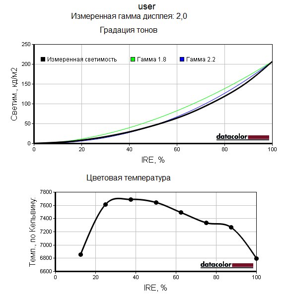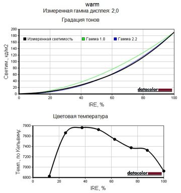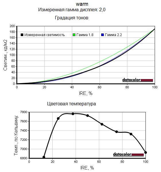 Следующие графики позволяют наглядно сравнить неравномерность цветовой температуры во всех четырёх доступных режимах, настройки цветовой гаммы при разных уровнях яркости, а также оценить гамма-кривые для этих режимов.