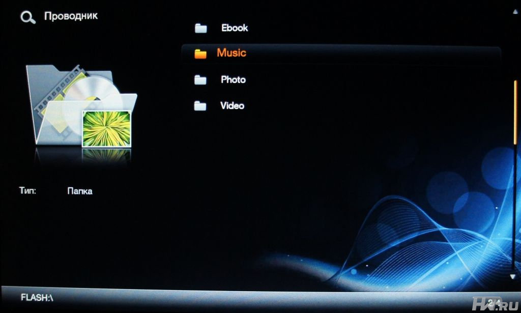 Главное меню выполнено в виде горизонтального ряда иконок. При подключении внешнего накопителя (или карточки) над иконками появляется меню выбора источника воспроизведения (например, смотреть видео со встроенной памяти или же с внешней). Содержимое флешек определяется мгновенно - сразу после подключения можно открывать проводник и просматривать контент, это радует.