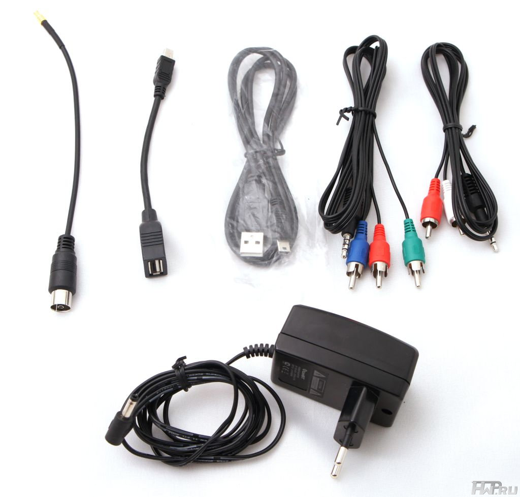 Чем нас обрадует производитель? Да всё, собственно говоря, как и всегда: сетевой блок питания, аудио и видео (компонентный!) кабели, USB кабель обычный и USB OTG (для подключения флешек и других накопителей), пульт ДУ и антенный переходник. Последнее представляет собой коротенький кабель - на одной стороне обычное антенное гнездо, на другой - миниатюрный штекер для сопряжения с плеером.
