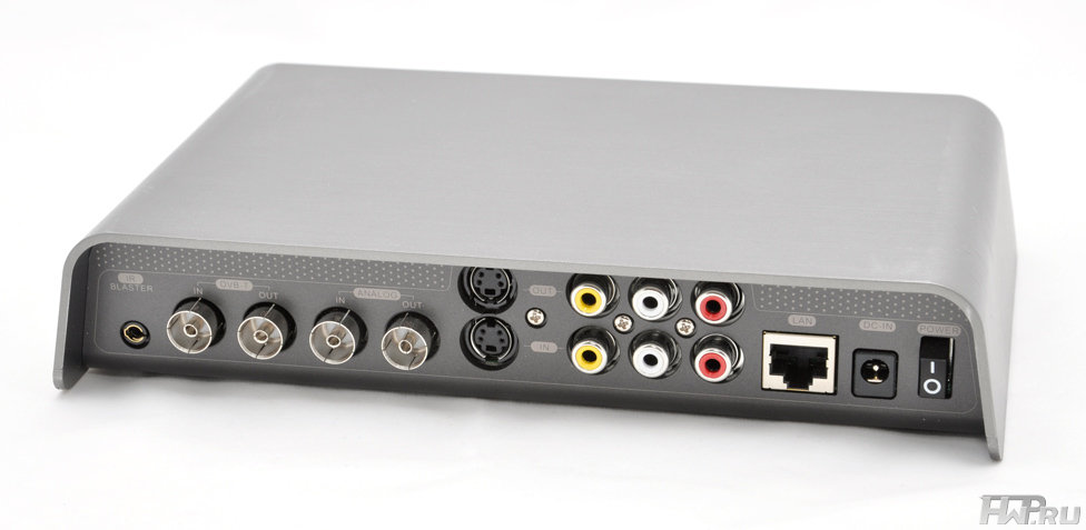 По набору гнёзд, сетевой тюнер больше напоминает сетевой медиаплеер, разве что, без HDMI порт. Слева направо здесь установлены: гнездо ИК-передатчика, сквозные гнёзда цифровой и аналоговой антенны, S-Video и композитные вход и выход, сетевой порт RJ45 и гнездо питания с выключателем. Плеер имеет 100-мегабитный сетевой контроллер, чего более чем достаточно для трансляции медиапотока HD качества со сжатием. Вообще, AverTV HomeFree Combo поддерживает HD-видео. Так что если в вашем регионе транслируются HD каналы в цифровом DVB-T формате, то пропускной способности сетевого порта должно хватить. Но об этом можно не задумываться - iPad не поддерживает HD видео, другие планшетники и телефоны - тоже.
