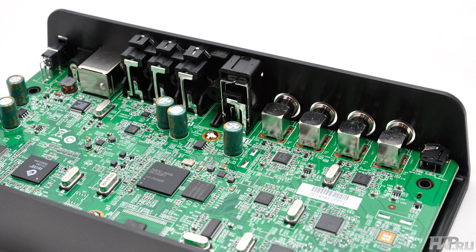 Охлаждение реализовано весьма оригинально - снизу на внутренней стороне корпуса расположена огромная алюминиевая пластина с теплопроводящими подушками. Плата электроники ложится на неё и отлично передаёт тепло на корпус. Хотя, тюнер греется не сильно.