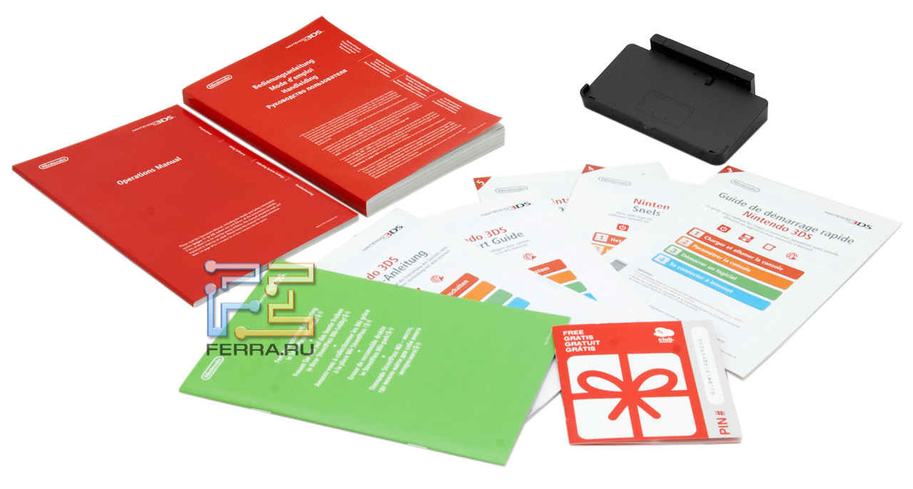 Nintendo 3DS продается в относительно небольшой коробке, весящей добрых полтора килограмма. Кроме, собственно, приставки, в коробке лежит зарядное устройство, крэдл («подставка») для зарядки, стилус (телескопический), множество промо-бумажек и огромная, на 500 страниц, иллюстрированная инструкция.