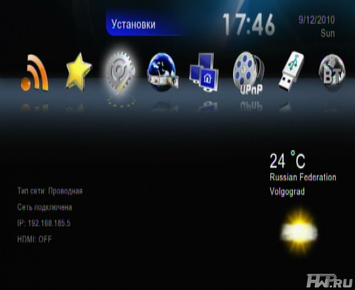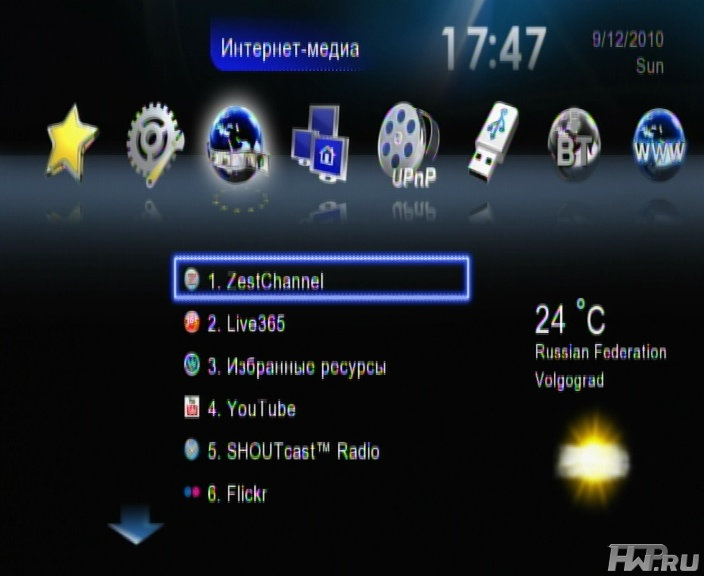 Основное меню выполнено в виде горизонтальной полосы. Из приятностей - погода вашего города прямо на главном меню. Из особо интересного в меню упомянем лишь веб-браузер, да такие интернет-сервисы, как интернет-радио, Youtube, Flickr и прочие.