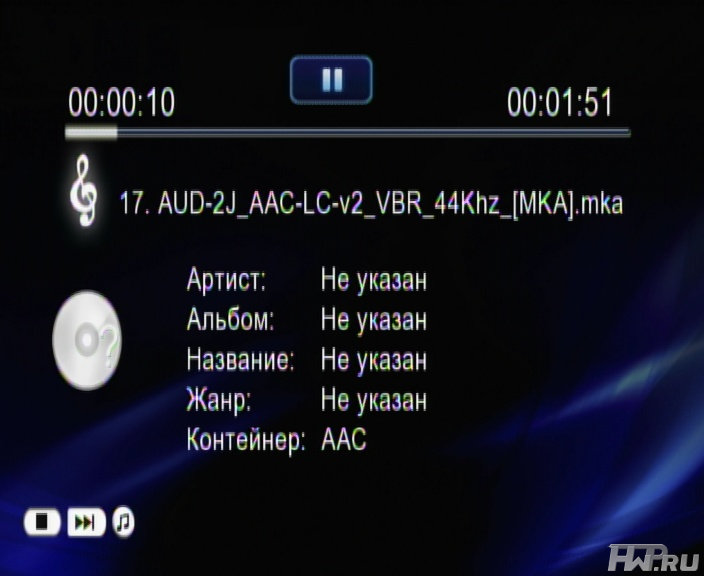 Аудиоплеер имеет привычный список выводимой информации - начиная с названия файла, исполнителя и альбома, заканчивая наименованием контейнера.