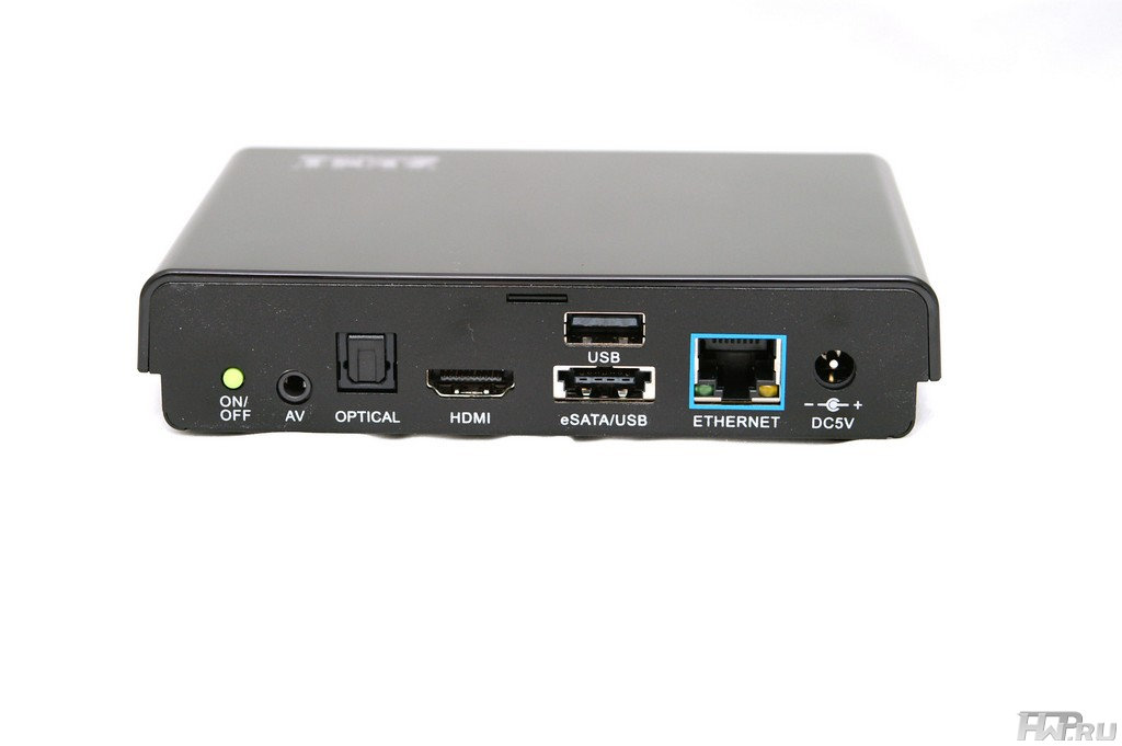 Задняя сторона имеет немного свободного места - всё пространство занимают порты. Слева направо: кнопка включения, аудио/видео выход (4х пиновый миниджэк - соответствующий кабель имеется в комплекте), оптический аудио выход, HDMI видеовыход, USB, комбинированный порт eSATA/USB, Ethernet порт и гнездо для подключения блока питания. Конечно, над HDMI мог бы разместиться еще один USB порт, но видимо компоновка платы не позволила этого сделать.