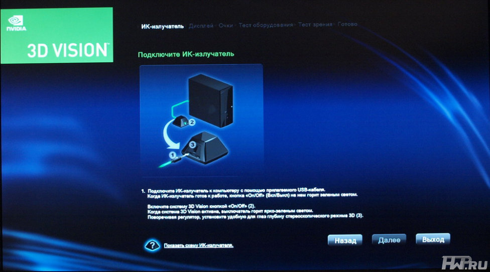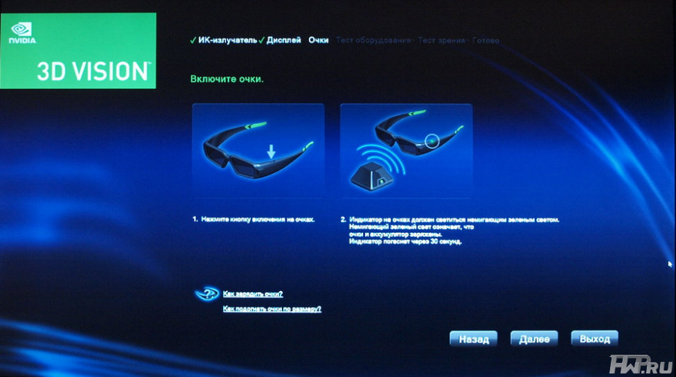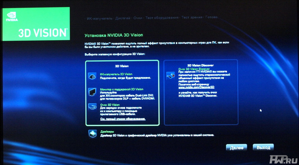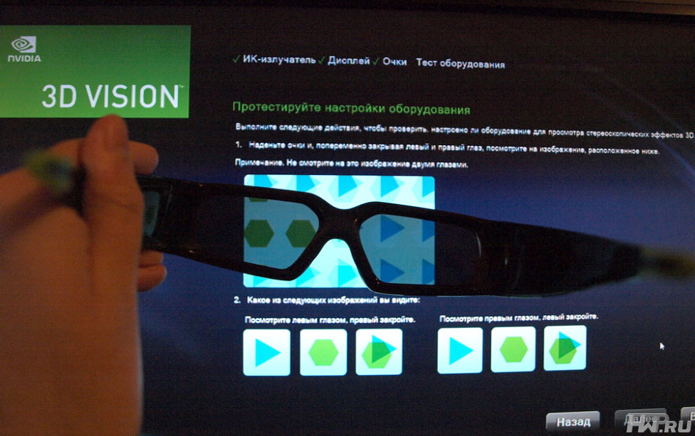 Для настройки системы 3D Vision предусмотрен удобный пошаговый мастер. Но сначала необходимо установить драйверы с прилагаемого диска. После этого потребуется зайти в панель управления драйвером видеокарты и выбрать там активацию режима 3D Vision, после чего запустится Мастер.