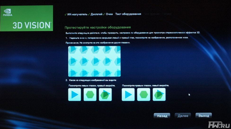 После настройки оборудования будет предложено протестировать систему, для чего на экран будут выведены тестовые изображения и предложено выбрать то, которое вы видите правым и левым глазом.