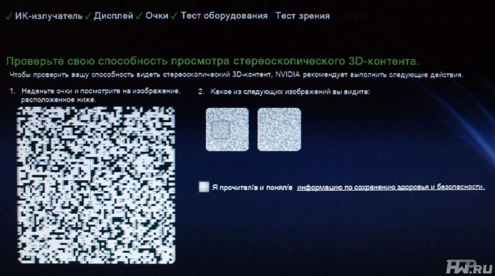 Затем будет проверена работа системы на предмет комфорта: заметите ли вы мерцание? В этом и есть важность применения монитора с поддержкой развертки 120 Гц: если применить обычный монитор без 120 Гц, то частота обновления будет эквивалентна 30 Гц, а это очень сильно вредит глазам. Да и в этом случае не удастся настроить систему. Затем будет предложено проверить вашу способность видеть стерео-изображение.