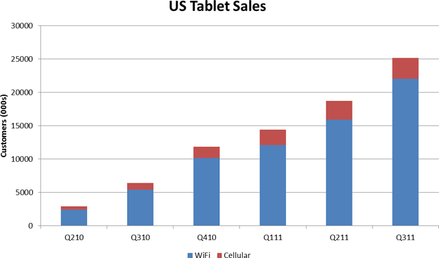 Новое исследование консалтинговой компании Chetan Sharma указывает на полное доминирование в США планшетов с модулем Wi-Fi без поддержки 3G или 4G — их доля составляет 90%. Результаты не детализированы на отдельные модели, но так как они основаны на данных прошлого лета, то есть до запуска Amazon Kindle Fire, необходимо учитывать, что Apple тогда принадлежало более 60% рынка, по данным IDC.