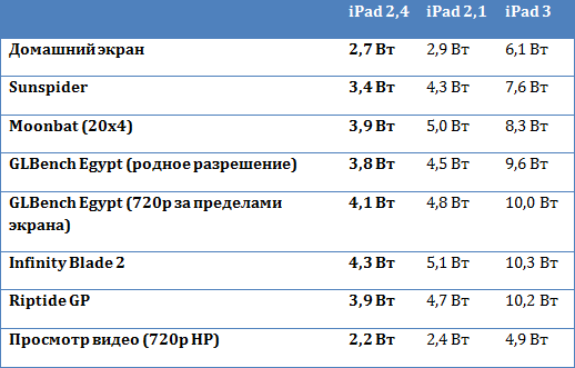 Что же получают пользователи от iPad 2,4? Благодаря 32-нм HKMG-техпроцессу — ощутимо увеличенное время автономной работы и пониженное тепловыделение. Сотрудники Anandtech протестировали iPad 2,4 против iPad 2,1 и против iPad 3, получив следующие результаты для энергопотребления всей платформы, включая экран: