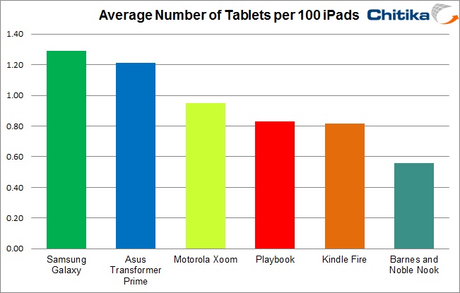 Ближайшим конкурентом является планшет Samsung Galaxy, занимающий долю в 1,22%. Планшет Barnes and Noble Nook, позиционируемый скорее как электронная книжка с планшетными возможностями, отвечает лишь за 0,53% трафика. На каждые 100 рекламных показов для владельцев iPad, число показов для Samsung Galaxy и ASUS Transformer Prime достигает немногим больше единицы, а для Motorola Xoom, BlackBerry PlayBook, Kindle Fire Barnes and Noble Nook — меньше единицы.