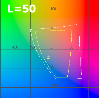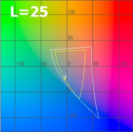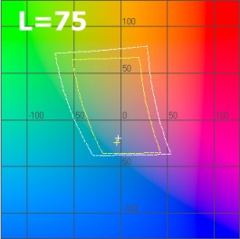 Для оценки цветового охвата использовался колориметр Spyder3 из комплекта Spyder3Studio. График цветового охвата строился для цветовой координатной системы Lab в координатах ab для светлости L=25, 50 и 75. На изображениях зелёная кривая — график цветового охвата дисплея тестируемого ноутбука, белая — стандартное цветовое пространство sRGB.