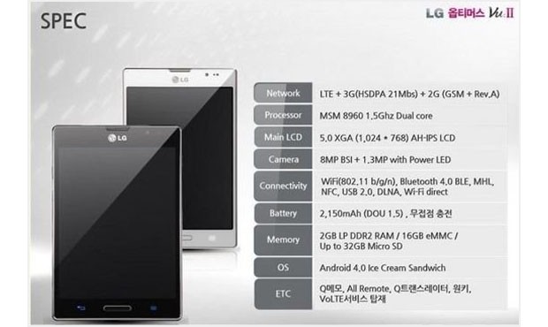 Если верить приведённому слайду, Optimus Vu II будет отличаться 1,5-ГГц двухъядерным процессором Qualcomm Snapdragon S4 MSM8960 (вместо NVIDIA Tegra 3 у предшественника), двумя гигабайтами памяти LPDDR2 (1 Гбайт у Optimus Vu), мощным аккумулятором ёмкостью 2150 мАч, а также поддержкой LTE. Среди других характеристик отметим 5-дюймовый дисплей с разрешением 1024 х 768 пикселей, 8-Мп тыльную и 1,3-Мп фронтальную камеры, операционную систему Android 4.0.