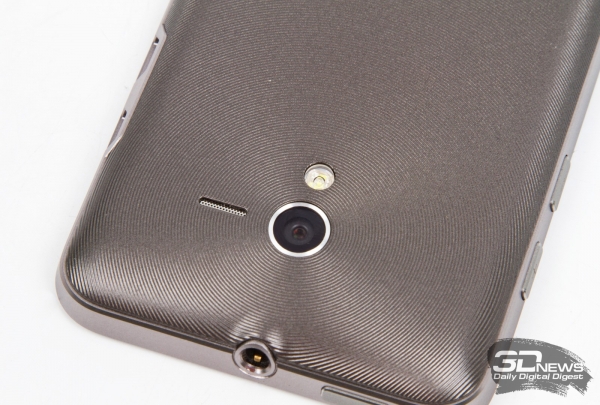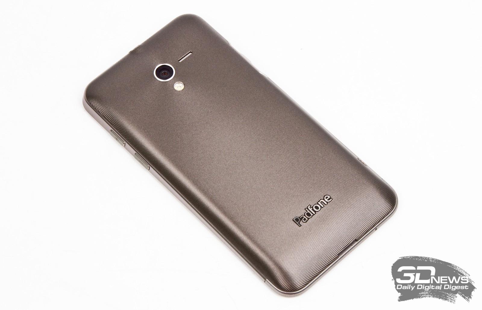 Отличительной чертой смартфона является задняя панель, которая выглядит очень необычно и интересно. Она рифленая: от камеры по всей поверхности расходятся концентрические круги, на которых можно создавать звучные скретчи. Здесь же можно увидеть глазок восьмимегапиксельной камеры, под которым находится светодиодная вспышка. Рядом расположен внешний довольно тихий моно-динамик. В нижнюю часть панели врезано название модели — PadFone, а под ним находится заметный скос, благодаря которому корпус гаджета имеет разную толщину.