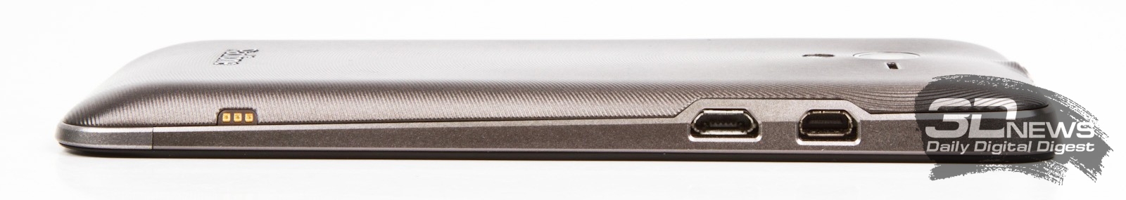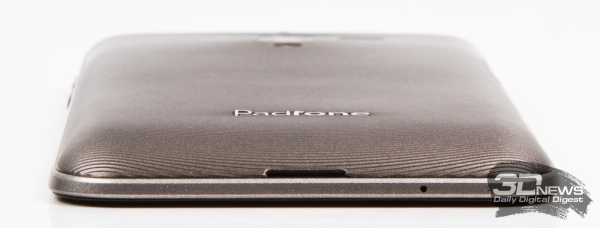 Видеовыход microHDMI версии 1.4a и интерфейс microUSB расположены на левой грани PadFone. В нижней части находятся контакты, необходимые для подключения к планшетному модулю PadFone Station.
