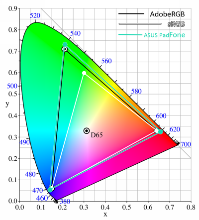 Цветовой охват дисплея смартфона ASUS PadFone (бирюзовый треугольник) в сравнении с цветовой палитрой sRGB (белый треугольник) и цветовой палитрой Adobe RGB (черный треугольник)