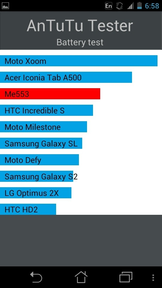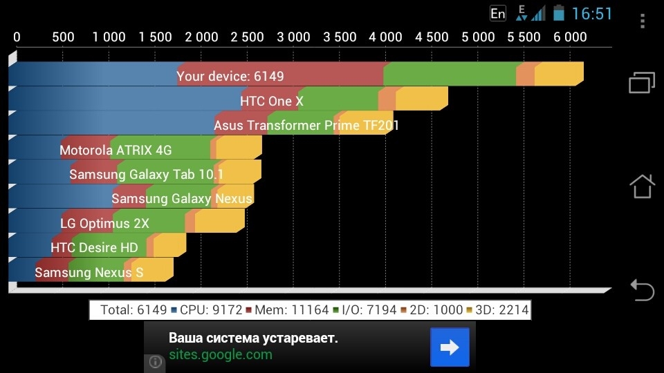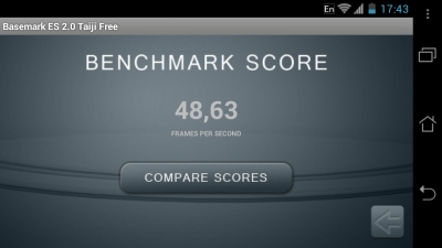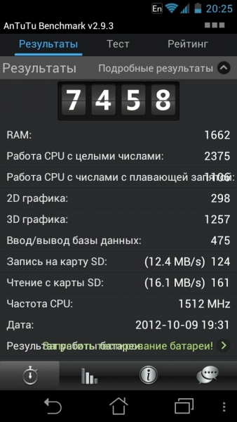 Итогами испытаний мы остались вполне довольны. Синтетические тесты Quadrant Standard 2.0 и AnTuTu Benchmark смартфон прошел без затруднений, набрав в первом 6149 баллов — очень приличный результат, а во втором — 7458. Итог хороший, но мы ожидали пятизначную оценку. Видимо, разработчикам теста нужно оптимизировать его для новых устройств. Мощный процессор обеспечивает смартфону очень приличное быстродействие. Смена экранов меню, прокрутка веб-страниц, воспроизведение HD-видео — всё это происходит плавно и в 99% случаев без тормозов (один процент съедается операционной системой — никто не знает, что «Ведроид» может выкинуть).