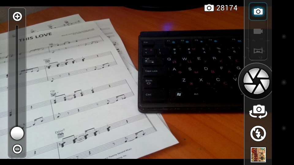 Интерфейс камеры смартфона прост и даже примитивен. Рабочая панель разделена на две небольшие зоны: левую и правую. В первой находится полоска приближения. Поскольку в мобильных устройствах доступен только цифровой зум, прибегать к нему стоит лишь по мере необходимости. В середине правой части расположена большая кнопка со значком апертуры — кнопка захвата снимка. Над ней находится переключатель режимов фото-, видео- и съемки панорам. Под ней — единственная доступная пользователю настройка: включение/отключение вспышки. Здесь же расположен переключатель между тыловой и фронтальной камерами. Из-за отсутствия специфических настроек создание фото происходит в один клик. Фокусируется устройство быстро (зона фокусировки выбирается нажатием на соответствующую область экрана).