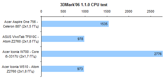 Intel Atom Z2760 — процессор очень, очень медленный. Даже если сравнивать с бюджетными ULV-процессорами Celeron, построенными на ядре Sandy Bridge, проигрыш весьма ощутимый. Если же говорить о более современных и дорогих ЦП Intel, то это даже не проигрыш — это разгром.