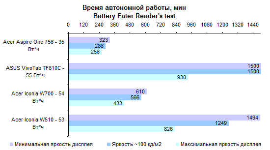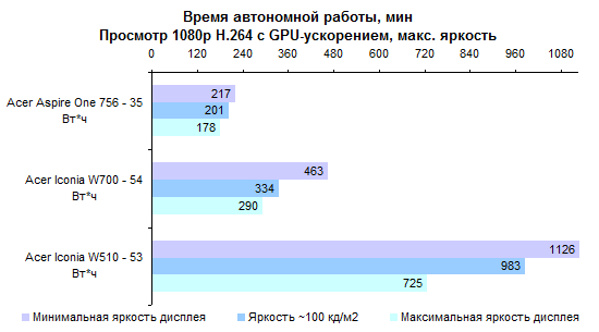 Как и все «атомные» планшеты-трансформеры, Iconia W510 весьма долго работает от одного заряда батареи. Если использовать устройство вместе с док-станцией, то на полный рабочий день свободы от проводов рассчитывать можно совершенно точно. Если озадачиться экономией энергии, сильно не нагружать процессор и снизить яркость, то вполне можно протянуть и два рабочих дня.