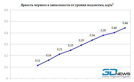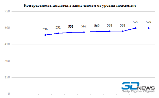 Максимальная светимость черного поля не превышает 0,44 кд/м2. Так что с контрастностью все очень даже неплохо: она достигает 600:1.