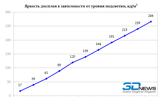 Характеристики матрицы средние: скажем, максимальная яркость составляет 266 кд/м2. Не то чтобы совсем мало, но для устройства, которое предполагает активное использование в самых разных ситуациях, — все же немного.