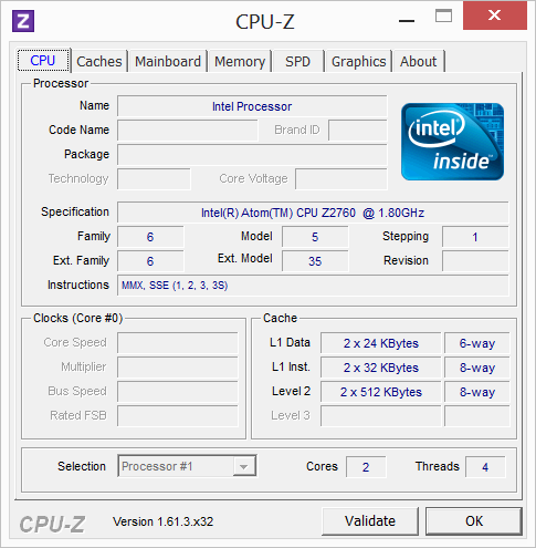 | Процессор | SoC Intel Atom Z2760: до 1,8 ГГц; 2x512 Кбайт L2; два вычислительных ядра |