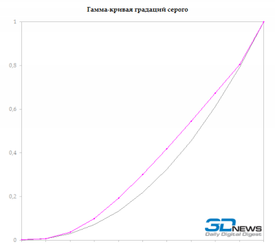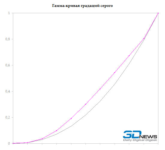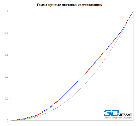 Дисплей ощутимо пересвечивает оттенки в средней части графика: на этом участке гамма-кривые практически превращаются в гамма-прямые.