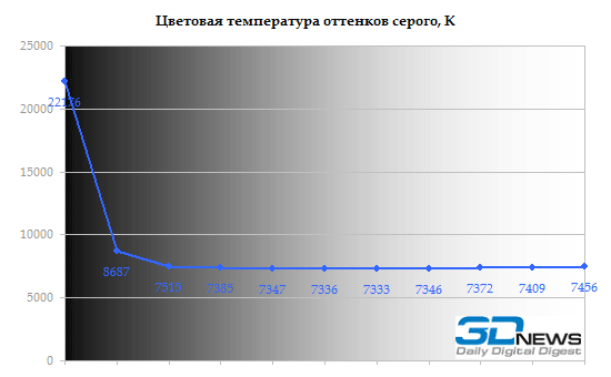 А вот настройки цветовой температуры весьма неплохие: температура градаций серого невысока и равномерна практически по всему градиенту — не считая некоторого повышения в окрестности черного, которое, впрочем, встречается чуть ли не во всех мобильных дисплеях, да и глазом это едва ли удастся углядеть.