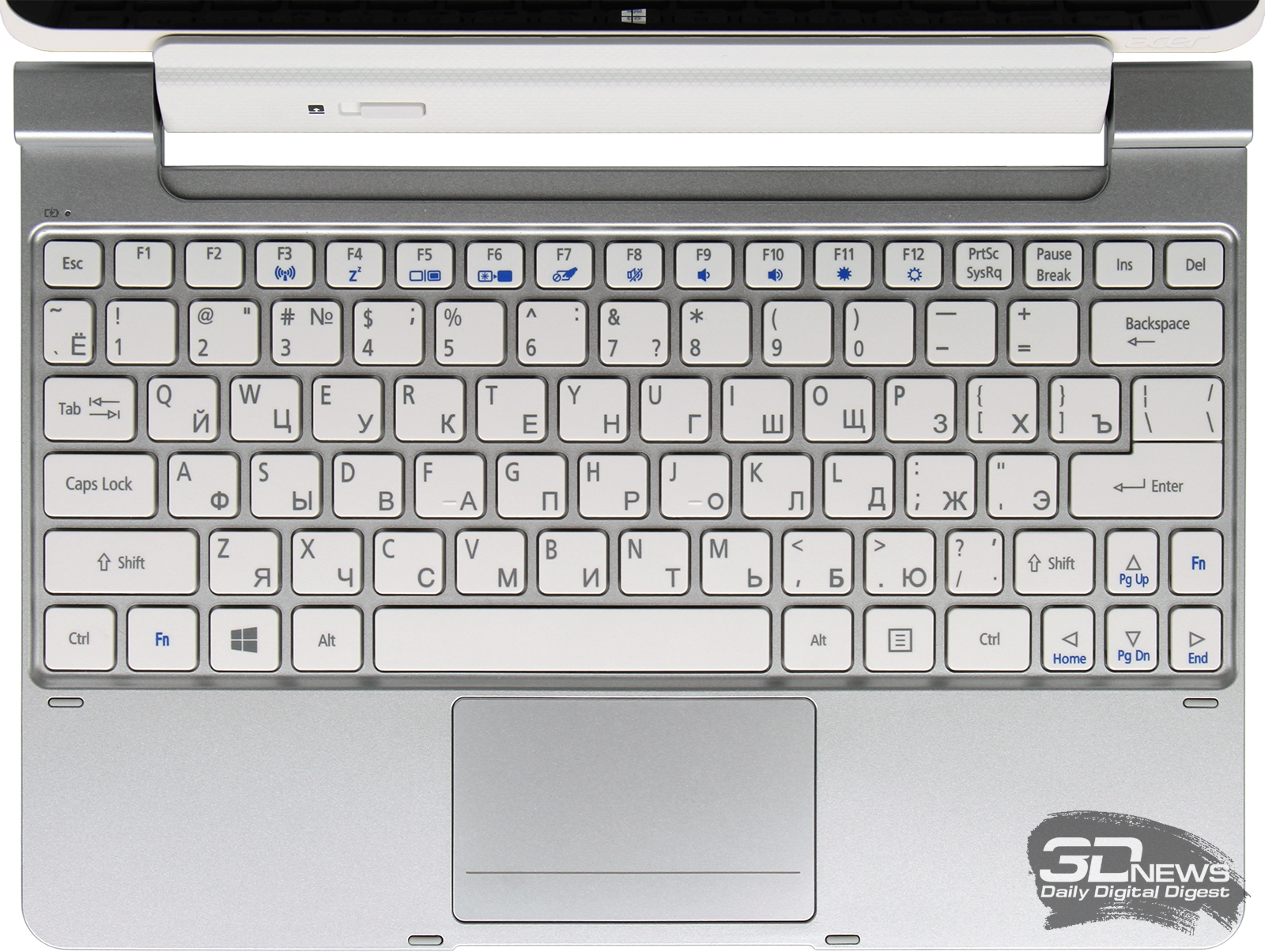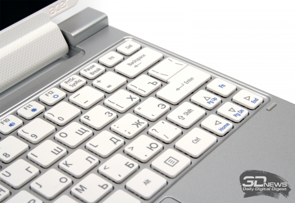 Клавиатура в док-станции не самая удачная: клавиши мелковаты, многие из них дополнительно ужаты. Механические свойства тоже изысканными не назовешь — клавиши довольно жесткие и очень шумные.