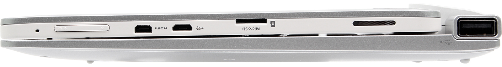 На корпусе довольно много разъемов, но из-за небольшой толщины устройства все они миниатюрные: Micro USB, Micro HDMI, MicroSD — по крайней мере конструкторы не стали чрезмерно увлекаться и хотя бы аудиоразъем сделали полноразмерным. Кстати, в комплекте есть переходник на стандартный порт USB 2.0 — чтобы подключить флешку, не придется топать в магазин.