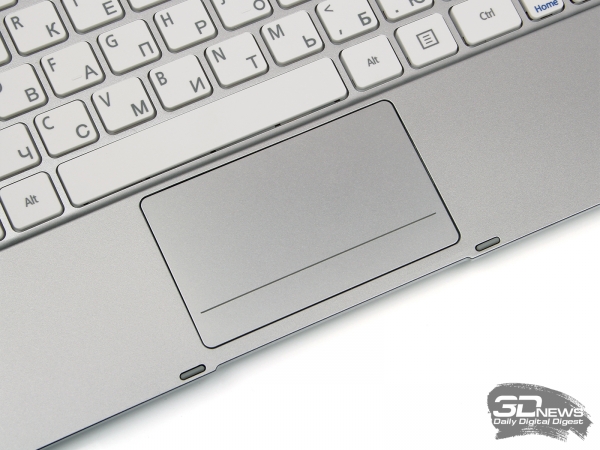 Есть в док-станции и сенсорная панель. Ее видимые размеры составляют 72х48 миллиметров. Реальные размеры сенсорной области еще меньше: сантиметровая полоса в нижней части лишена чувствительности и отдана под кнопки мыши. Кнопок, кстати, физически две: левая и правая — так что панель только выглядит как «бескнопочная», на самом деле она классическая.