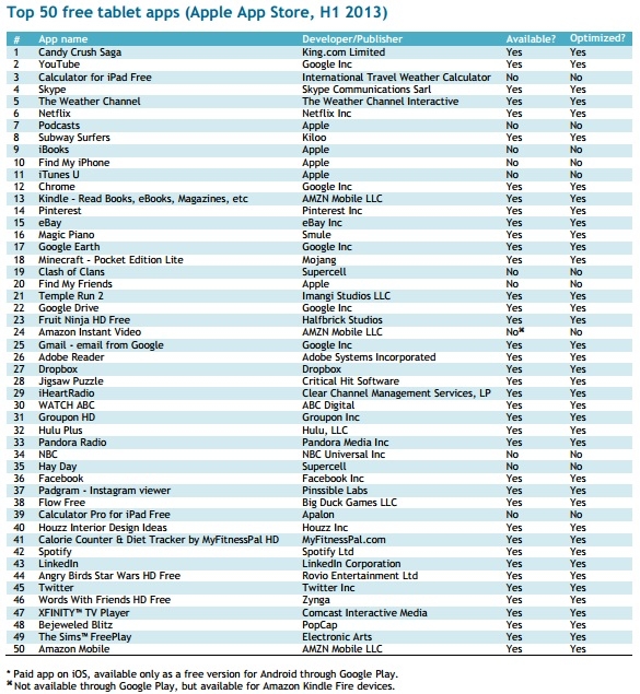 Для того чтобы провести сравнение, аналитики Canalys составили список из 50 самых популярных приложений в американском AppStore. Список был составлен на основании ежедневных сводных рейтингов за первую половину года. В него вошли как платные, так и бесплатные приложения.