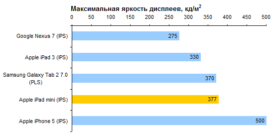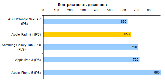 По яркости планшет даже превосходит iPad 3 — 376 кд/м2 против 330 у «большого брата». По контрастности — примерно баш на баш: 655:1 у маленького и 718:1 у большего. То есть очень даже неплохо, в том числе и по планшетным меркам. Разве что абсолютное значение светимости черного все-таки высоковато — 0,57 кд/м2, так что в темном помещении черный цвет кажется несколько более серым, чем у «ретинопада».