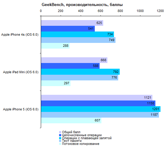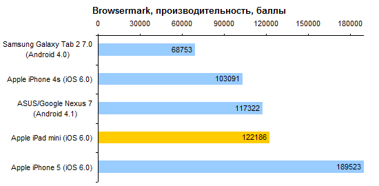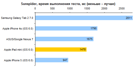 Результаты тестов производительности предсказуемые — планшет оказался очень быстрым. Правда, от iPhone 5 все равно отстает. Забавно, что Geekbench определяет устройство как iPad 2.5. Не тормозит на нем ничего: игры летают, сайты тоже открываются без задержек — владельцы iPad 2 или iPhone 4s, обновившиеся до iOS 6.0, могут наблюдать примерно то же самое.