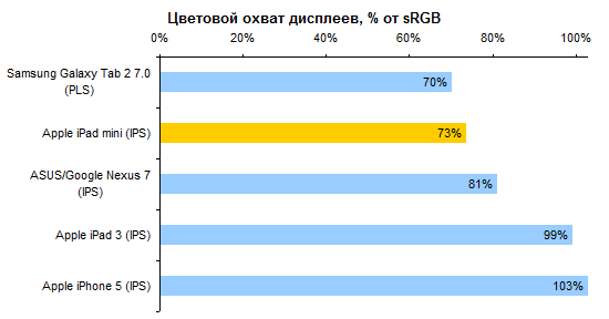 А вот с цветовым охватом все не то чтобы хорошо: 73,5% от цветового пространства sRGB. При сравнении с iPad 3 недостатки дисплея маленького «айпада» видны невооруженным глазом: цвета получаются не такими сочными, хотя в целом картинка выглядит все-таки неплохо. Чай, не 50% от sRGB, как у каких-нибудь безродных «китайцев».