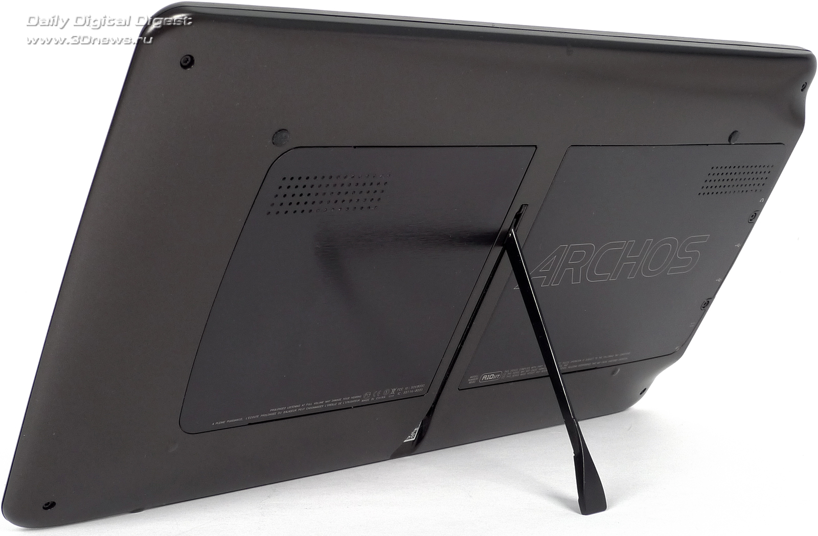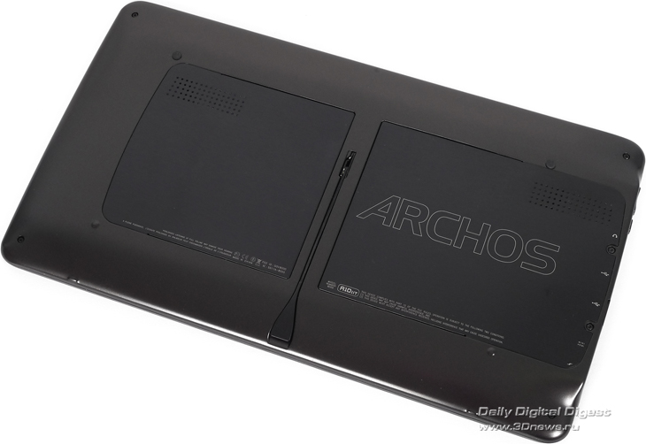 В Apple для решения проблемы с подставкой изобрели чехол с «волшебными магнитами». В Archos подошли к проблеме иначе, пожалуй, более удобным и менее накладным для покупателя образом: в заднюю стенку планшета встроена откидывающаяся ножка.