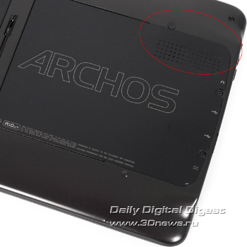 У подставки обнаружился неприятный недостаток. В спрятанном положении она скрипит. Корпус и без того недостаточно жесткий, и при сжатии пластиковые панели прогибаются с легким поскрипыванием. «Аккомпанемент» ножки убивает последние шансы на ощущение качественно собранного устройства. Отошедшая металлическая «наклейка» на задней панели также не улучшила впечатления от Archos 101.