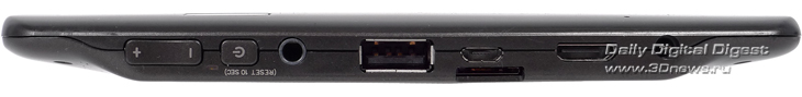 Планшет достаточно щедро оборудован проводными интерфейсами. Есть и Micro USB для связи с компьютером (кабель в комплекте), и полноразмерный USB host — он позволяет подключать даже мобильные жесткие диски без внешнего питания, не говоря уже о флешках. Плюс есть устройство чтения карт памяти формата MicroSD и цифровой видеовыход. К сожалению, разъем не полноразмерный — mini HDMI, а кабеля в комплекте нет.
