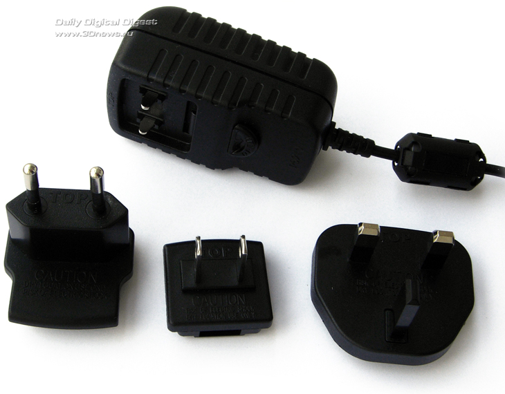 Комплектный блок питания больше всего похож на зарядку от телефона — маленький и легкий. Что может обрадовать путешественников, вилки на нем съемные — в нашем случае компанию евроштепселю составляли его британский и американский родственники.
