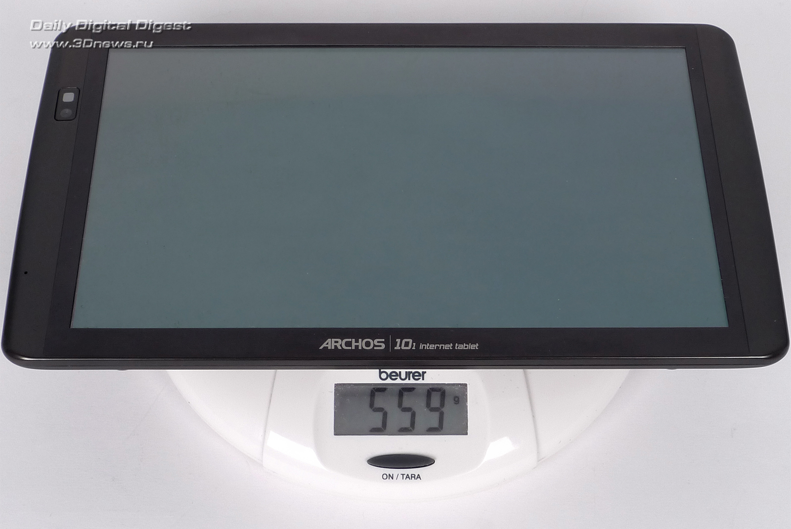 В графе «масса» заявленных производителем характеристик красуется весьма приятное значение: 480 грамм, значительно меньше, чем у iPad, что первого, что второго. Однако результаты взвешивания протестированного нами экземпляра оказались совсем иными — 560 грамм. Особенности тестового образца? Хотелось бы верить.